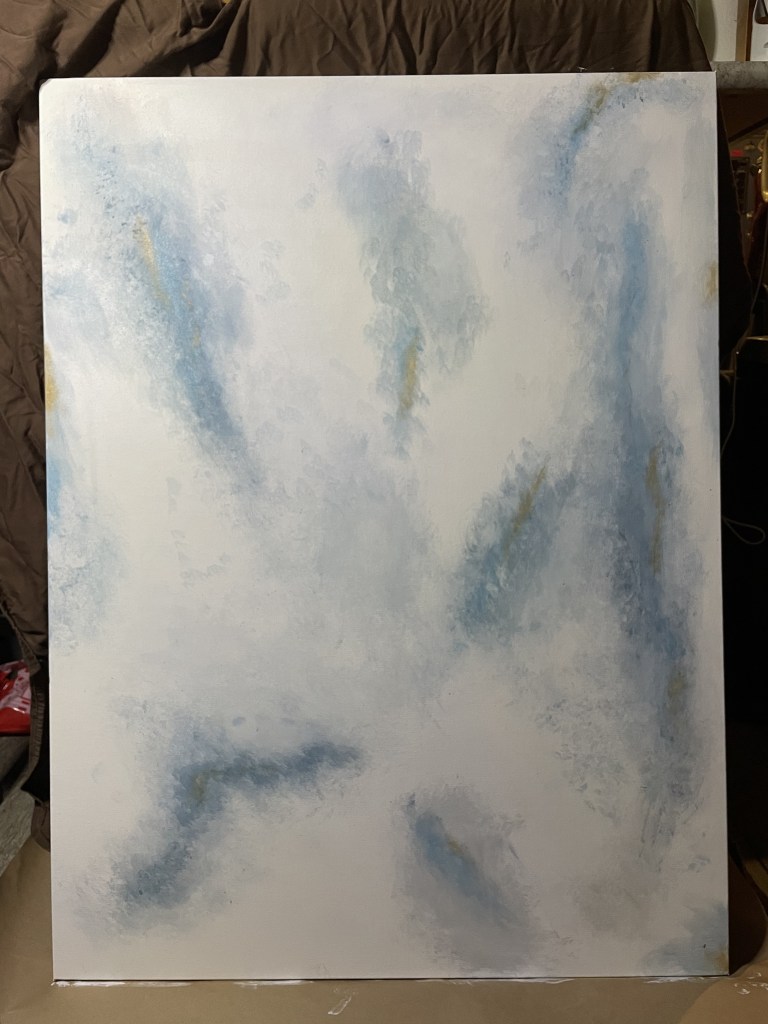 At first, I mostly dipped my large fluffy brush into the white, occasionally dipping my brush into the grey and blue, spreading the paint around to blend, then continuing to brush over the drying areas in a circular motion for that cloudy blue on the negative space.