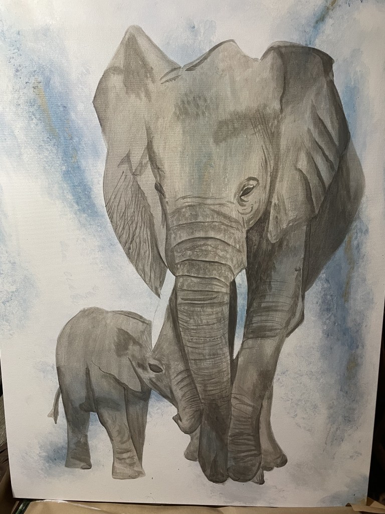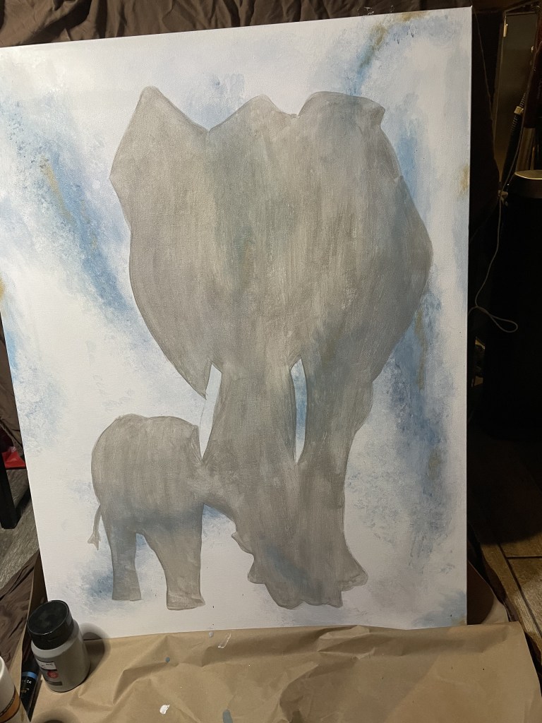 I knew I wanted the background to show just a bit through the elephants. To achieve that, I watered down my grey in a plastic cup and painted a single layer, not worrying too much about streaks.