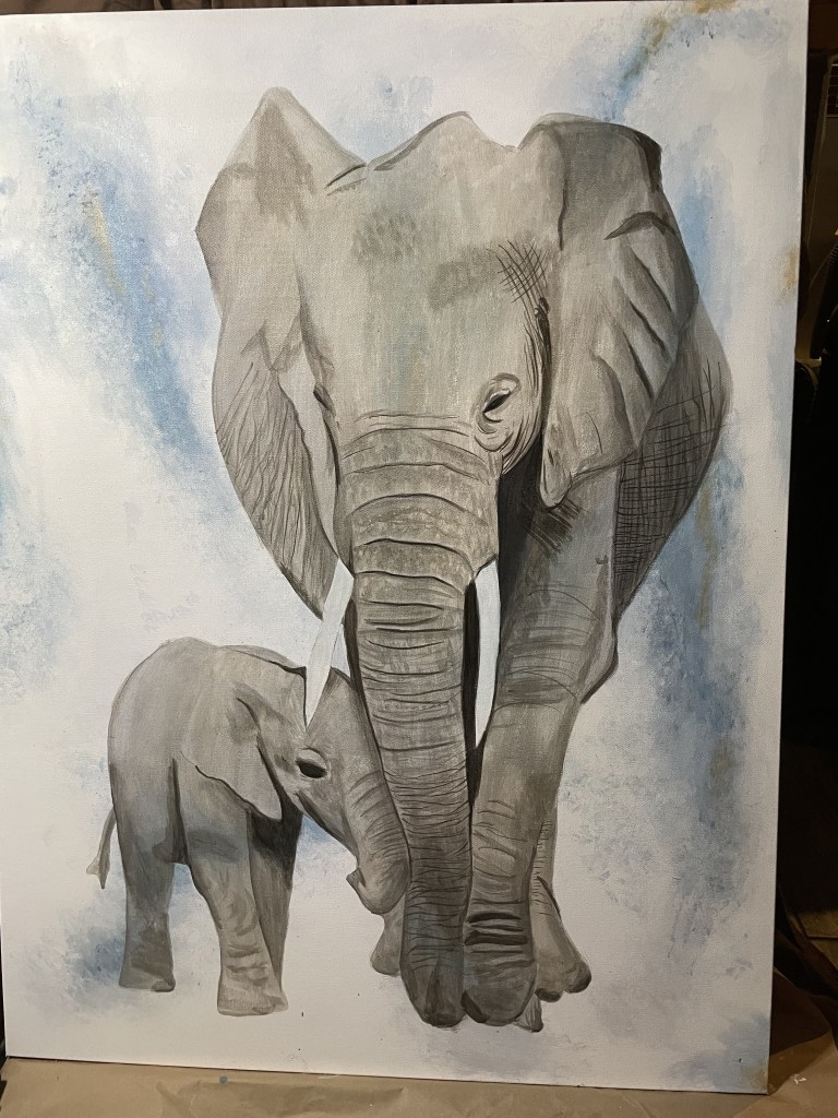 Painting is something I haven’t done much of lately, but last week I was able to purchase three 30×40 inch stretched canvases from Michaels on a buy one, get TWO FREE deal! When I bought the canvases, I immediately had this elephant painting in mind.