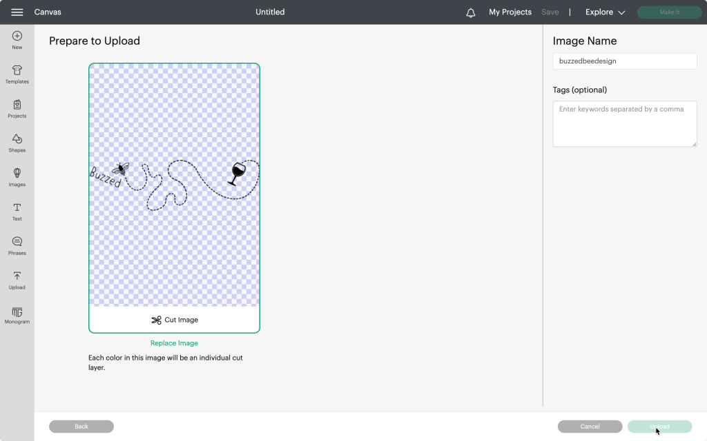 Our next step is to upload the design onto the program. To do this, you will need to start a new project, click the upload button, then upload your file onto the design space. Since this file is an svg file, cricut will automatically recognize it as a cut only file. Then simply add your design to the design space.