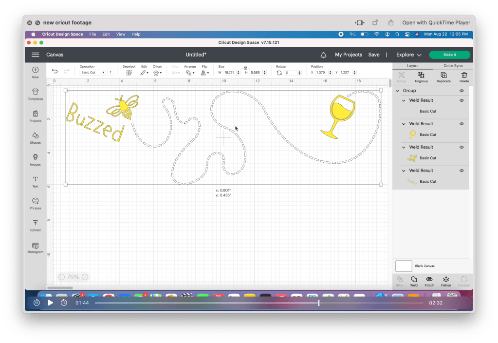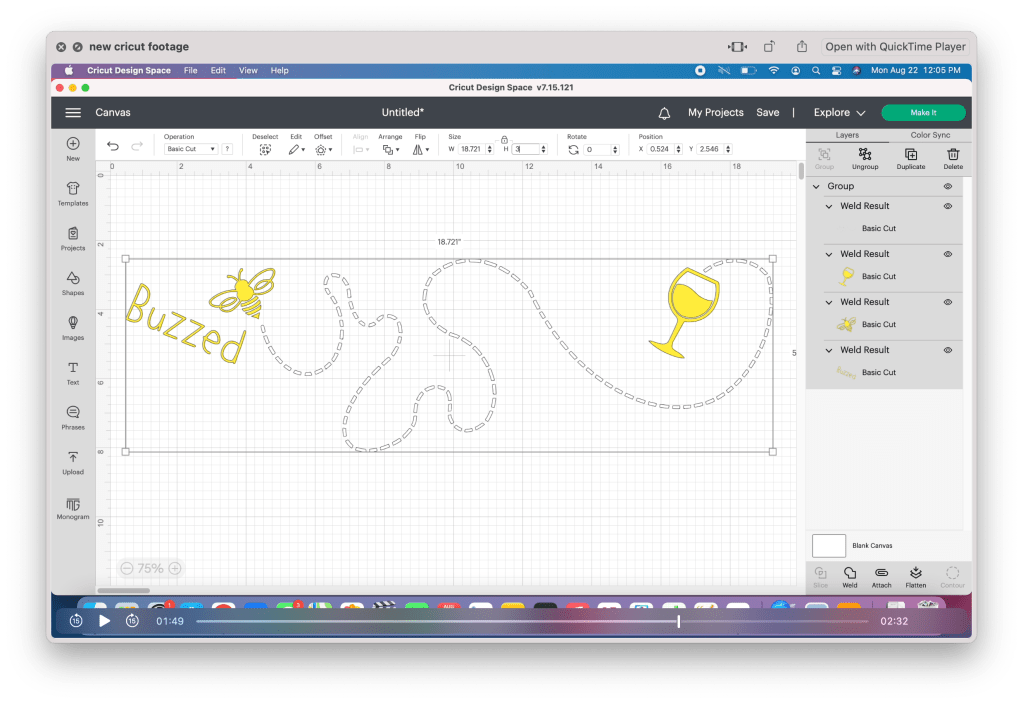 Now that the file is in the design space, it’s time to weld each of the separate pieces together. The simplest way to do this is to ungroup the image, then click and drag your cursor, selecting one piece at a time and welding them together. I recommend turning off the visibility after each one to prevent accidentally selecting it with the remaining pieces.