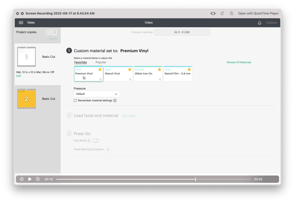 For permanent vinyl, I always set the dial to “custom” and select the “permanent vinyl” setting.
