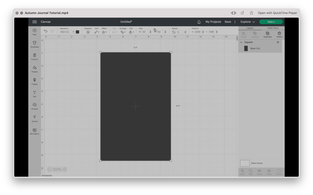 Our first step is to create a shape for our stencil. Open a new project, and add a square to the design space. Unlock the shape and set it to the size needed. Since I am using an A5 journal, I will need to set the shape to five and a half inches by eight and a half inches.