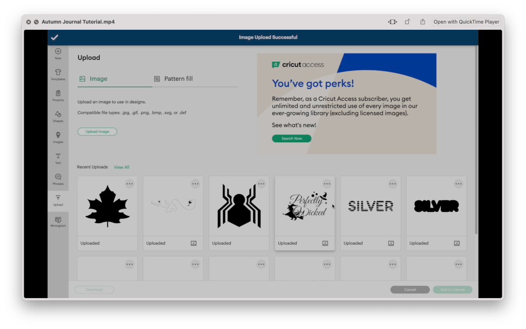 Next, upload the files you will be using. For this project, I am only uploading the leaf silhouette SVG files. I knew I wanted a quote at the center, so I put together this using procreate. You find the download on the materials list, or use one of the various designs available on Etsy.
