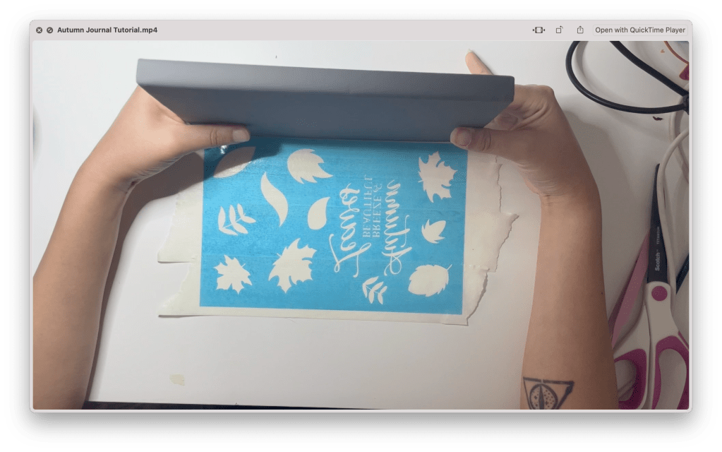 When transferring your stencil to the journal surface, DO NOT use transfer vinyl. I’ve learned that Transfer vinyl is often too sticky and can lead to the stencil vinyl tearing. Instead, using masking tape, laying it on the stencil then removing the backing. Line the journal up to the stencil and press it flat. Then remove the masking tape, one strip at a time, pushing down any smaller details that may lifting with the tape.