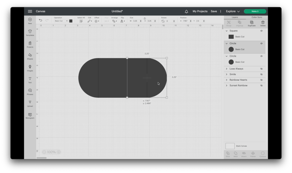 Add a circle and set it to the same height as the rectangle. Line up the circles to both sides and weld the entire shape together. Then adjust to the correct length. I had to adjust the overall shape to 6.5″