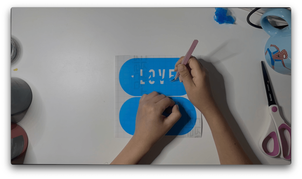 Cut your stencil vinyl to the needed size and place it on your cricut mat. Set the dial to custom and select the stencil vinyl setting. Weed out the design using a pair of pointed tweezers or a weeding tool.