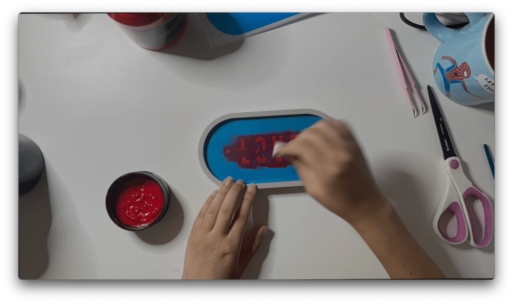 Part of the way through the painting process, I realized I could not use the cursive lettering stencil for two reasons. One was that I was unable to layer the two due to lack of visibility. The other was the acrylic paint was too delicate and peeled off when layering stencils. Instead, I used a fine point paintbrush to carefully paint on the cursive writing.
