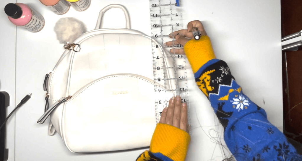 Using a pencil and ruler, measure the width of the purse base and separate it into six lines. Sketch the cloud shape and connect the lines to the cloud. Don’t worry about the pencil marks, the paint will cover them up later.