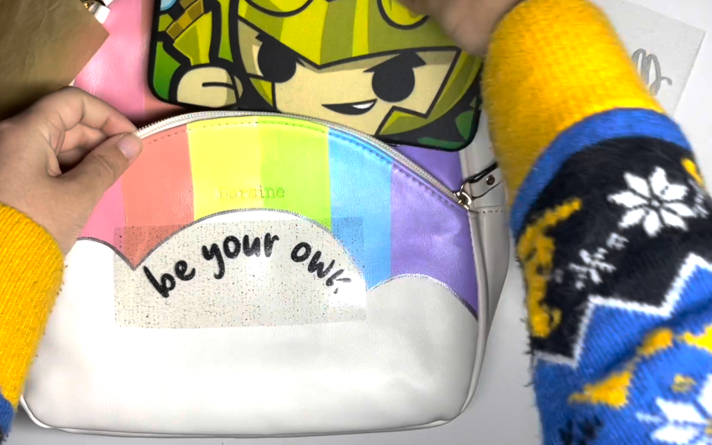 Working in ten second intervals, iron on the HTV onto the purse until the plastic easily lifts.