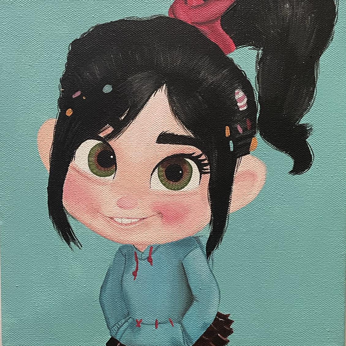 I knew I wanted to stick to animated characters, but I didn’t want to limit myself to a particular style. When I decided I was going to paint fictional characters, I asked my mom if she had a preference. She selected Vanellope von Schweetz as my first subject. For those of you who don’t know who that is, Vanellope is a quirky and energetic character from the Disney animated movie, Wreck it Ralph. She is an outcast racer in a racing arcade game with a candyland style. Since she is a 3-D animated character, I at first worried I would be unable to capture her energy and adorable appearance.