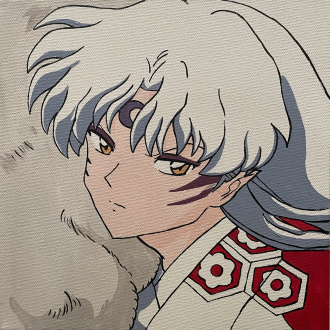 Next I asked some friends to tell me who some of their favorite animated characters were. One of the girls recommended a few anime characters who were familiar to me. As soon as she gave me her list, I just had to paint Sesshomaru. Sesshomaru is a character from the Japanese anime, “Inuyasha”. He is the demon half-brother of the titular character. He is an antagonist at the start, but eventually became a common fan favorite due to a subtle shift in his nature. He was actually a little more difficult to paint because of the many line details, but I was happy with the result.